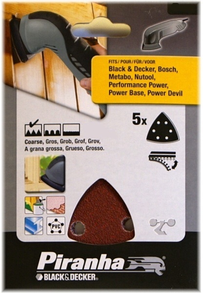 Brusné papíry na suchý zip - děrovaní - z příslušenství Piranha pro delta brusky Black & Decker.
